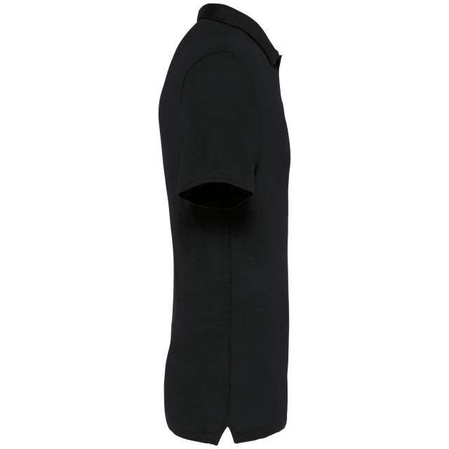 Collar with collar stand and V-shaped buttonless polo shirt placket in main material